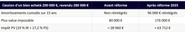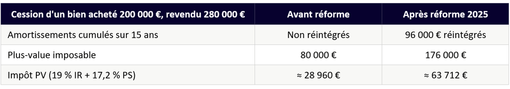 ⚠️Réforme 2025 à intégrer impérativement : depuis le 15 février 2025 (loi de finances 2025, article 84), les amortissements déduits pendant la période de location, y compris ceux pratiqués avant 2025, sont réintégrés dans le calcul de la plus-value imposable lors de la cession du bien. Le double avantage antérieur (déduction des amortissements en phase locative ET plus-value calculée sans réintégration) a pris fin.