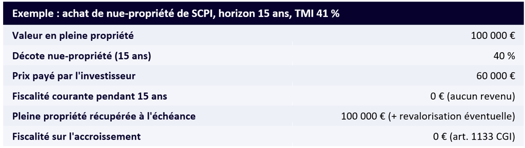 L'achat de nue-propriété de parts de SCPI est une technique très souvent utilisée pour les contribuables fortement imposés. L'investisseur achète uniquement la nue-propriété, l'usufruit étant cédé temporairement à un institutionnel pour une durée de 5 à 15 ans, voire 20 ans.