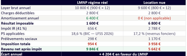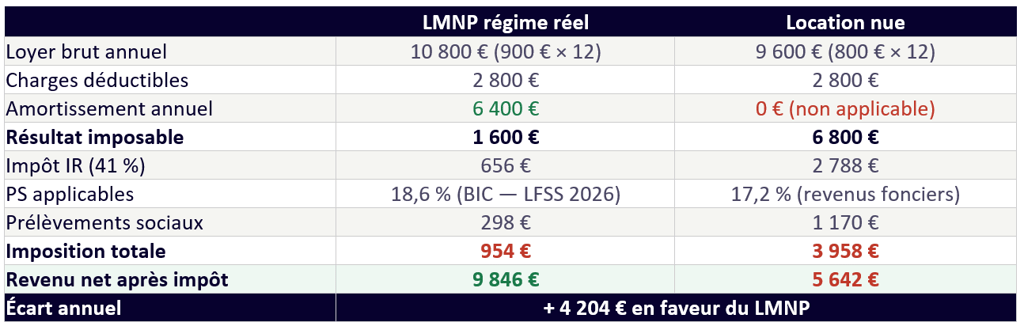 Les charges déductibles sont identiques dans les 2 cas à des fins de comparaison. Le différentiel de PS (18,6 % vs 17,2 %) résulte de la LFSS 2026 : les revenus BIC (LMNP) sont soumis à la hausse de CSG, les revenus fonciers (location nue) en sont exonérés par dérogation. Le tableau ne tient pas compte de la réintégration des amortissements à la revente (réforme LFI 2025).