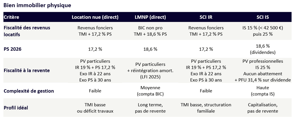 Ces 2 dimensions sont indépendantes et combinables. Une SCPI peut être détenue en direct, via une SCI IS, en nue-propriété ou au sein d'un contrat d'assurance-vie. Un bien physique peut être détenu en direct sous le régime de la location nue ou du LMNP, via une SCI IR ou IS, ou en démembrement. La fiscalité applicable découle de cette combinaison actif/structure, et non de l'actif seul.