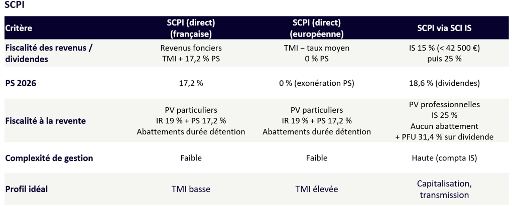 C'est pourquoi qualifier la SCPI de « véhicule fiscal » constitue une approximation très fréquente mais fausse : la SCPI est un produit d'investissement immobilier. Sa fiscalité dépend entièrement de la manière dont l'investisseur la détient.