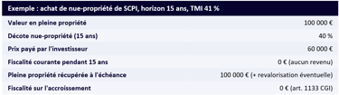 Cette technique est combinée avec la détention via SCI : une SCI peut acquérir la nue-propriété de parts de SCPI, permettant d'associer l'avantage du démembrement (zéro fiscalité courante) à la structure de détention adaptée à la situation patrimoniale et successorale.