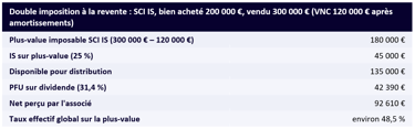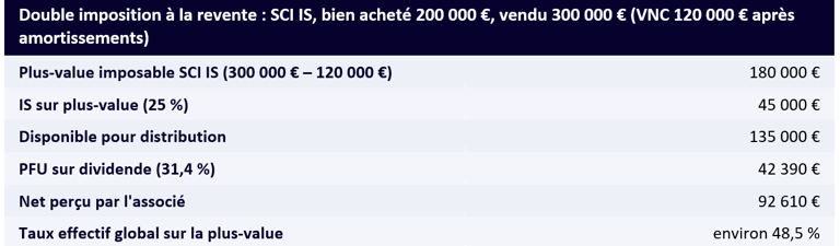 Le piège structurel de la SCI IS : la double imposition à la revente. Contrairement à la détention directe, la SCI IS relève du régime des plus-values professionnelles sans abattement pour durée de détention. La plus-value est taxée à l'IS (25 %), puis si le produit de la vente est distribué aux associés, une seconde imposition intervient au PFU de 31,4 %.