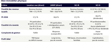 Les réformes récentes (réintégration des amortissements LMNP, dualité des taux de PS, maintien du régime LMNP longue durée) ont redessiné les frontières d'efficacité entre les structures. Pour un contribuable à TMI 41 % ou 45 %, la question n'est plus de choisir entre immobilier physique et SCPI : c'est de déterminer dans quelle structure chaque actif doit être logé pour maximiser le rendement net.