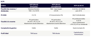 💡Point clé à retenir : la SCPI est un produit d'investissement, pas une structure fiscale. Les revenus qu'elle distribue sont fiscalisés dans les mains de l'investisseur selon la structure dans laquelle il détient ses parts. C'est ce que la partie suivante développe.