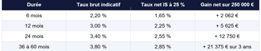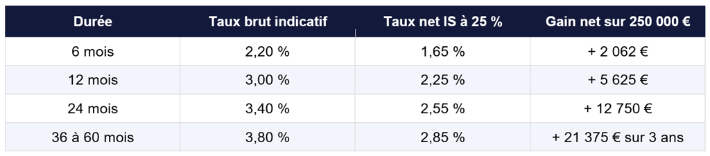 Exemple : une SAS place 300 000 euros sur un CAT 12 mois à 3 % brut. Elle perçoit 9 000 euros d'intérêts en fin d'année, intégralement imposables à l'IS. Au taux de 25 %, l'impôt est de 2 250 euros. Le gain net IS s'établit à 6 750 euros, soit un rendement net de 2,25 %.