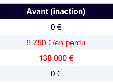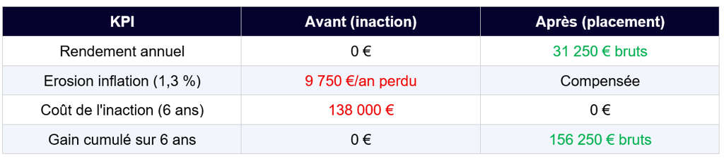 1. L'inaction a un coût réel et chiffrable : entre l'érosion inflationniste et le manque à gagner, laisser la trésorerie dormir sur un compte courant peut représenter plusieurs centaines de milliers d'euros sur 6 ans.