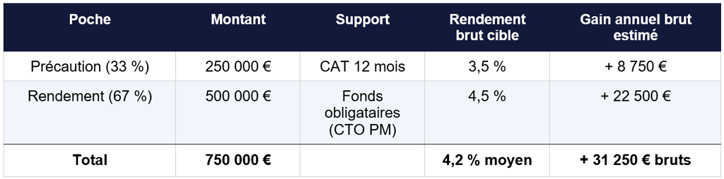 Pour la société de conseil BtoB avec 750 000 euros de trésorerie investissable, la proposition d'allocation se structure naturellement autour de 2 poches complémentaires.
