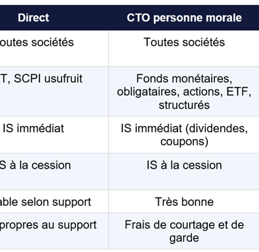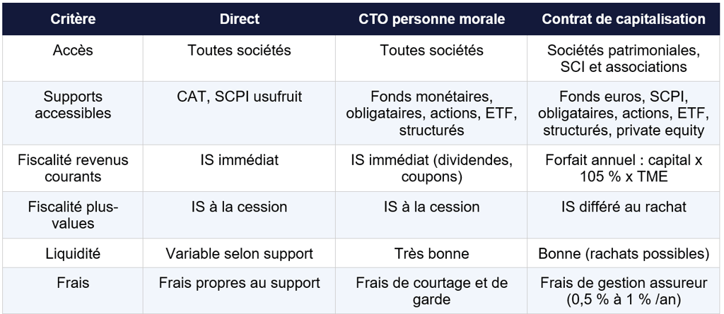 Certains supports s'investissent sans enveloppe intermédiaire : c'est le cas du compte à terme (CAT) et de la SCPI en usufruit temporaire. La société contracte directement avec la banque ou la société de gestion. La fiscalité est celle de l'IS de droit commun : les intérêts ou loyers perçus s'intègrent au résultat imposable de l'exercice, au taux de 15 % jusqu'à 42 500 euros de bénéfice (PME éligibles) puis 25 % au-delà.