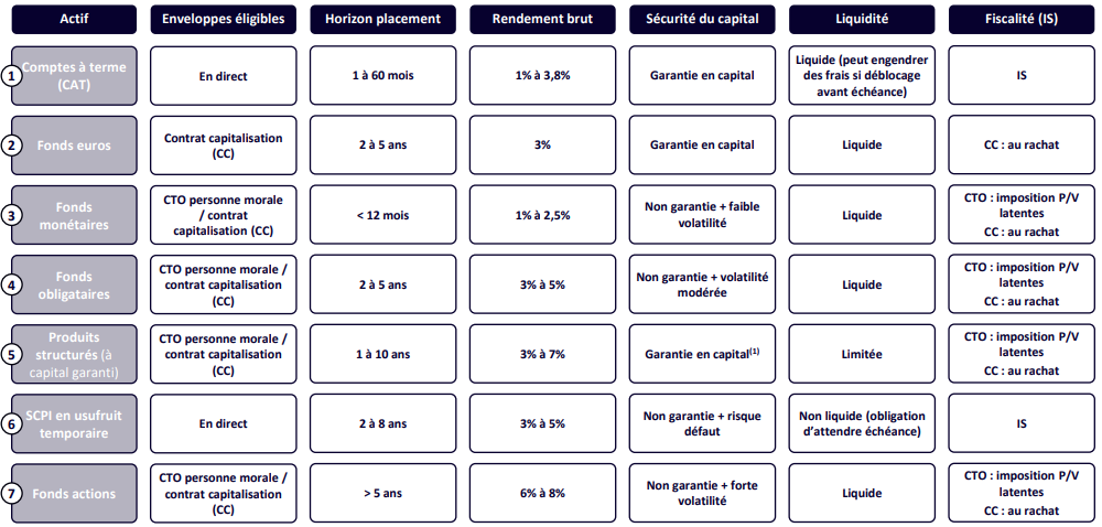 Seules les sociétés patrimoniales, associations et SCI ont accès aux contrats de capitalisation d'une compagnie d'assurance française. Les sociétés opérationnelles (industrielles, commerciales, artisanales) ne peuvent PAS y souscrire. Pour ces dernières, le compte-titres ordinaire personne morale (CTO PM) est l'enveloppe de droit commun donnant accès aux fonds monétaires, obligataires, structurés et actions.