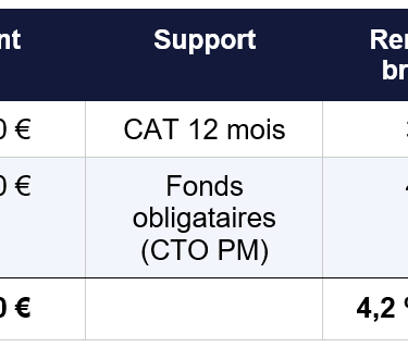 Exemple d'allocation : dans notre cas concret, la poche de rendement de 500 000 euros est investie en fonds obligataires diversifiés investment grade via un CTO personne morale. Le rendement cible est de 4,5 % brut annuel, soit 22 500 euros de gains bruts annuels. Sur 6 ans, le gain cumulé brut de cette poche seule atteint environ 156 000 euros (hors réinvestissement des coupons).